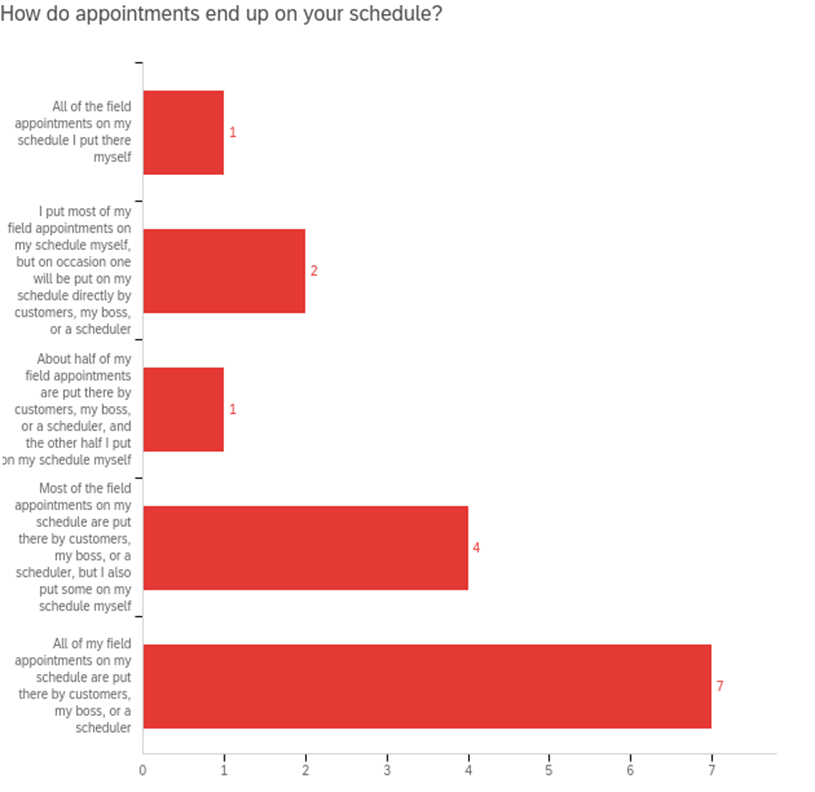A significant portion of the participants turned out to be “player coaches” – folks in supervisory roles that still went out on jobs or at least did so in the very recent past. I say “turned out to be” as though it were an accident, but we purposefully chose people that could represent multiple perspectives and it was a very wise choice. Because a lot of our data ended up looking a lot like this: